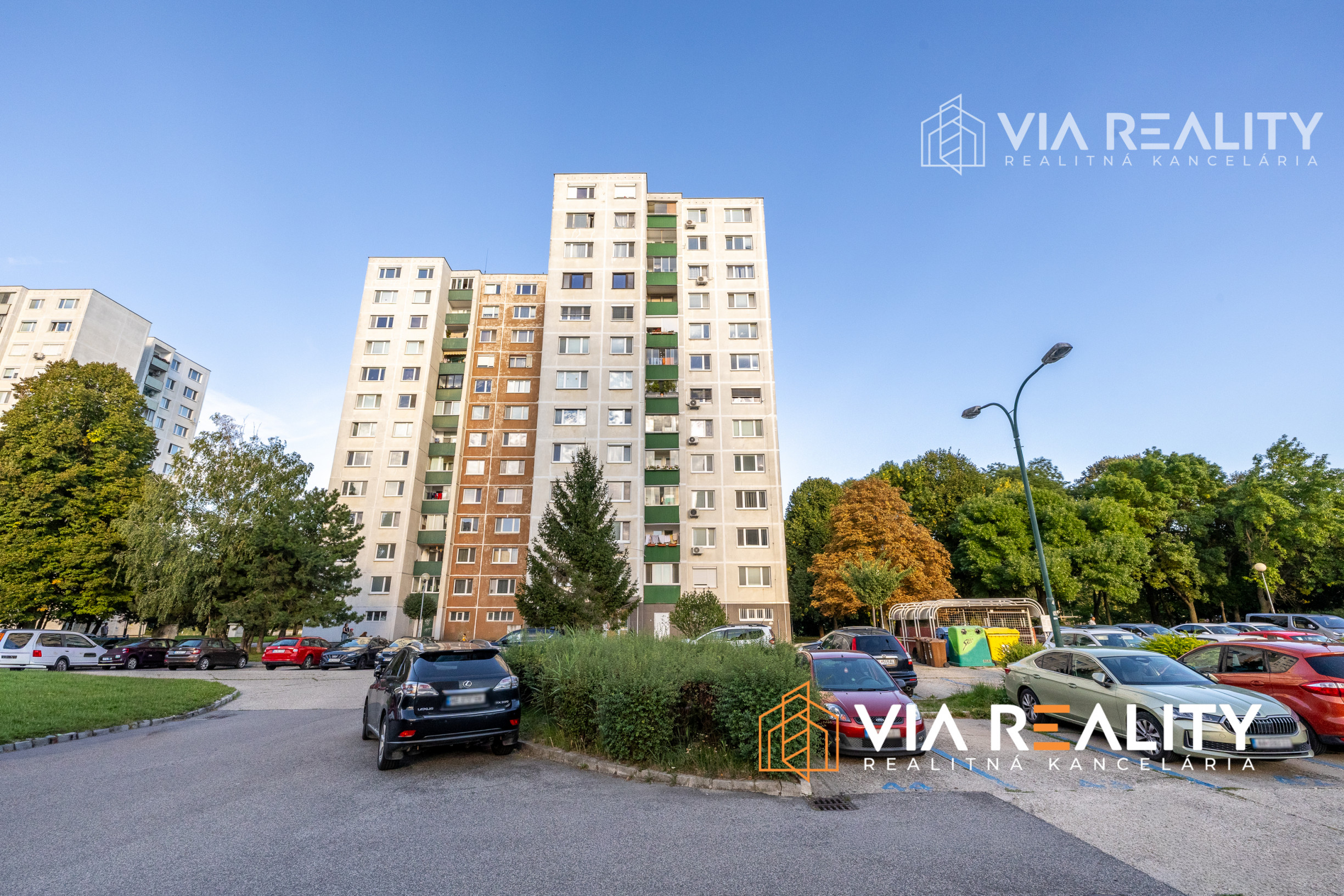 Pred bytovým domom sa nachádza veľké parkovisko.