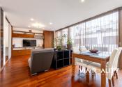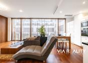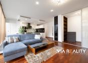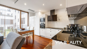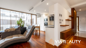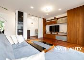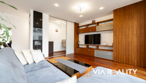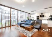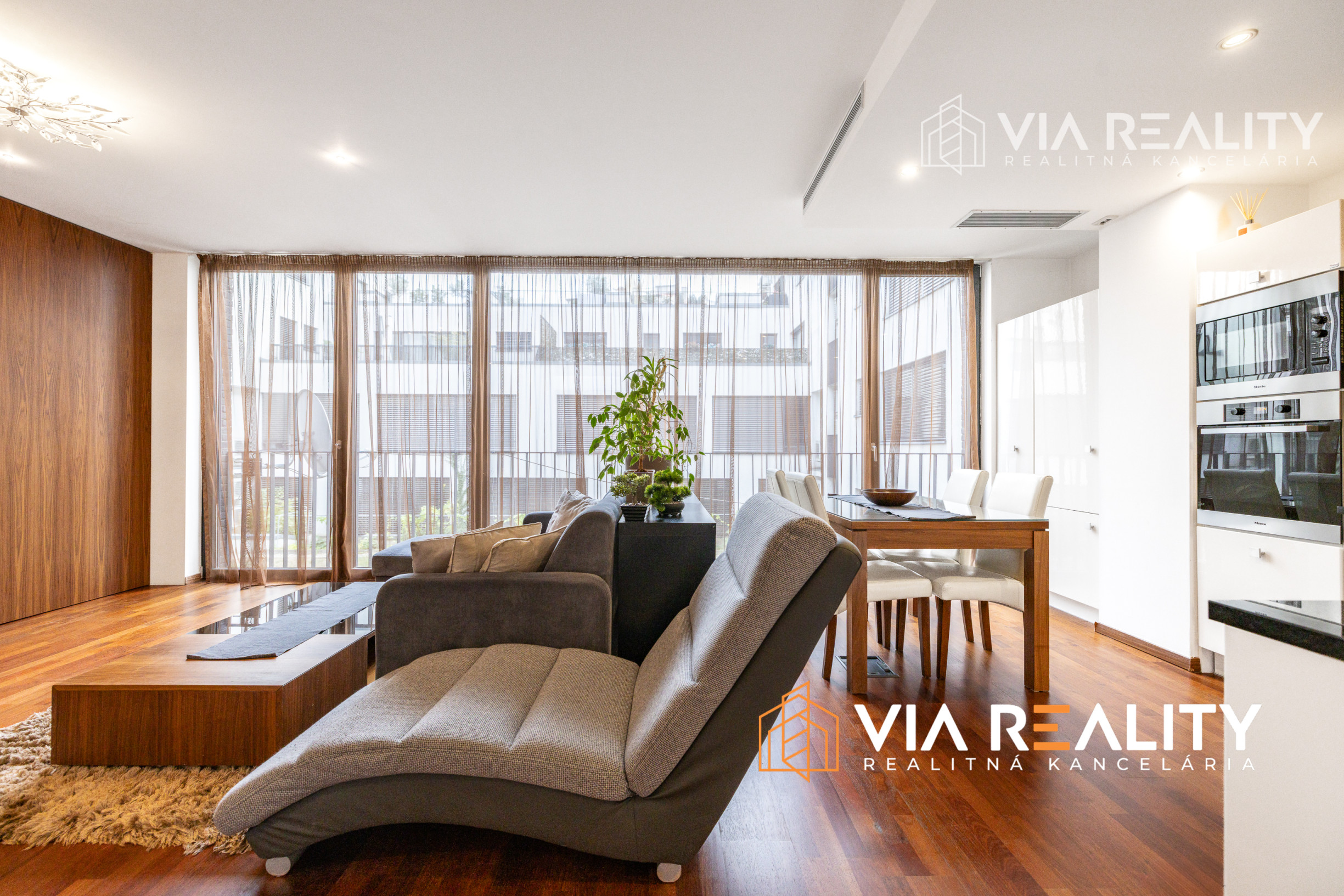Dominantou obývačky je celopresklená stena orientovaná do tichého zeleného átria. Priestor pôsobí exkluzívne, je svetlý, vzdušný a vizuálne väčší. V prípade potreby je možné kompletné zatemnenie vďaka elektricky ovládaným vonkajším žalúziám.